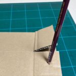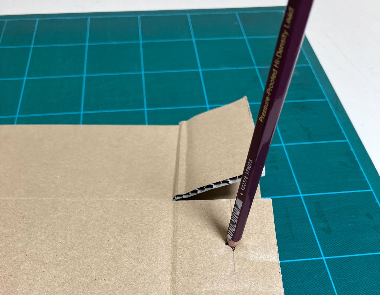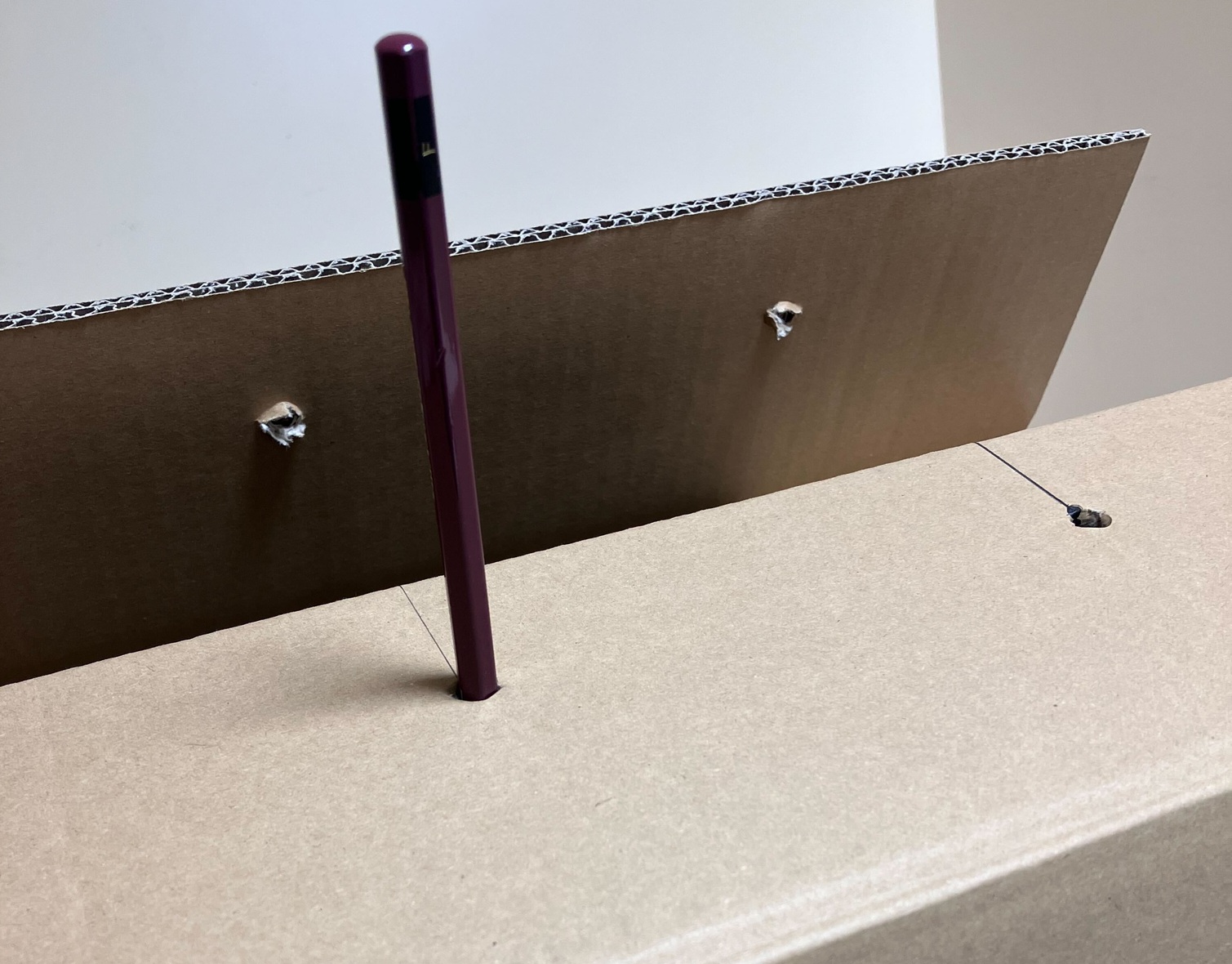 2:鉛筆(先の尖っているもの)を刺し、ねじ入れながら紐が通せる程度に穴を広げる。