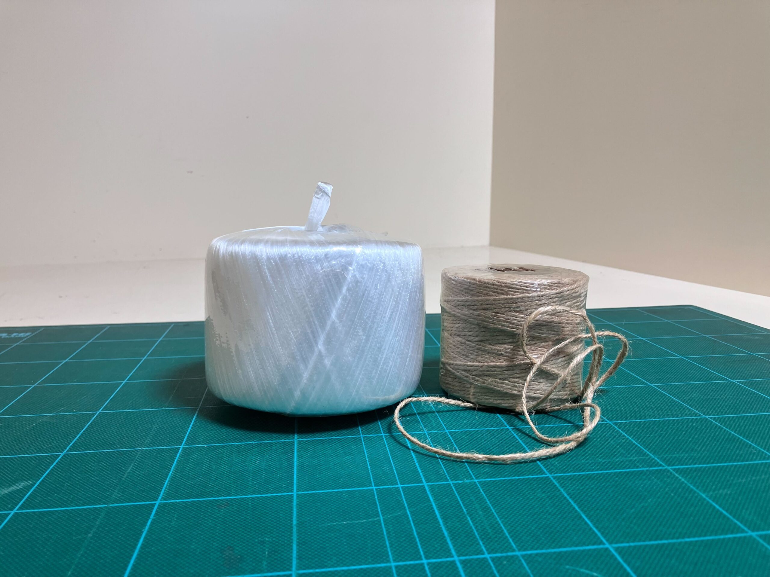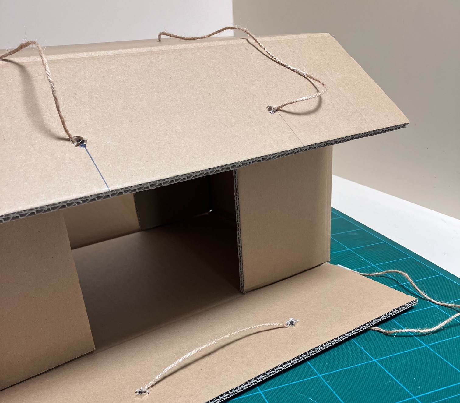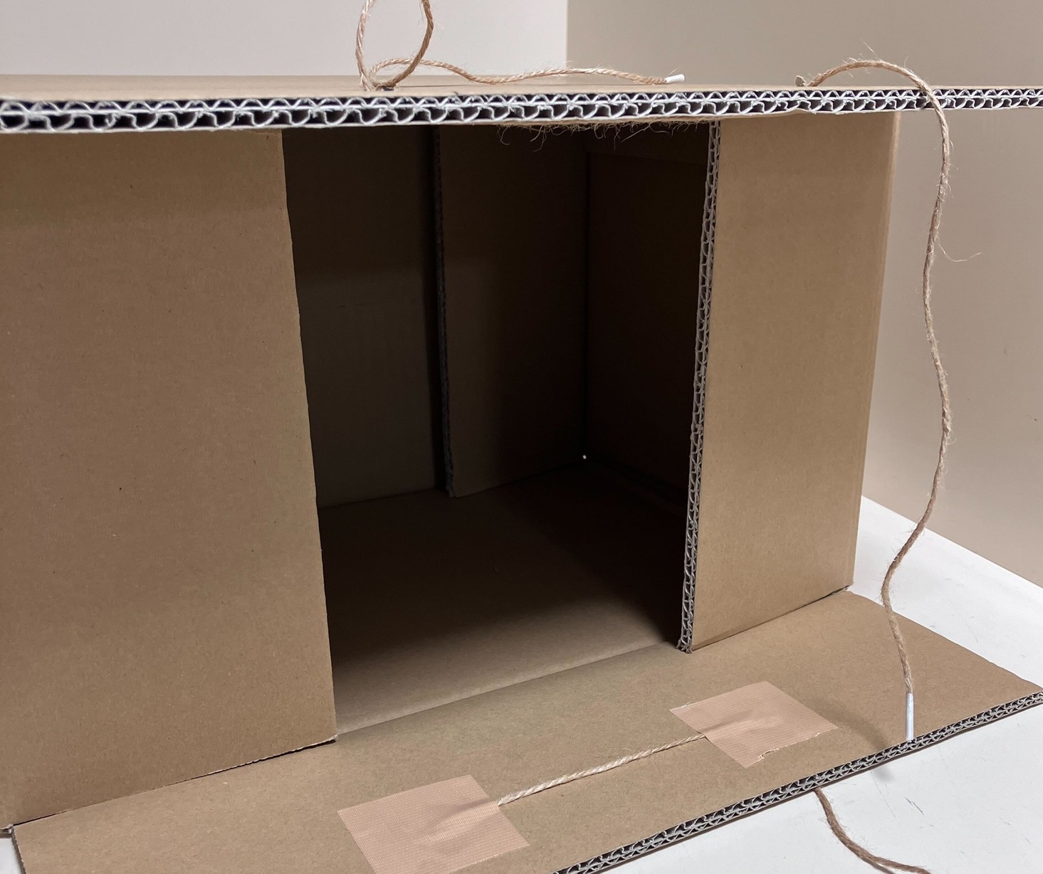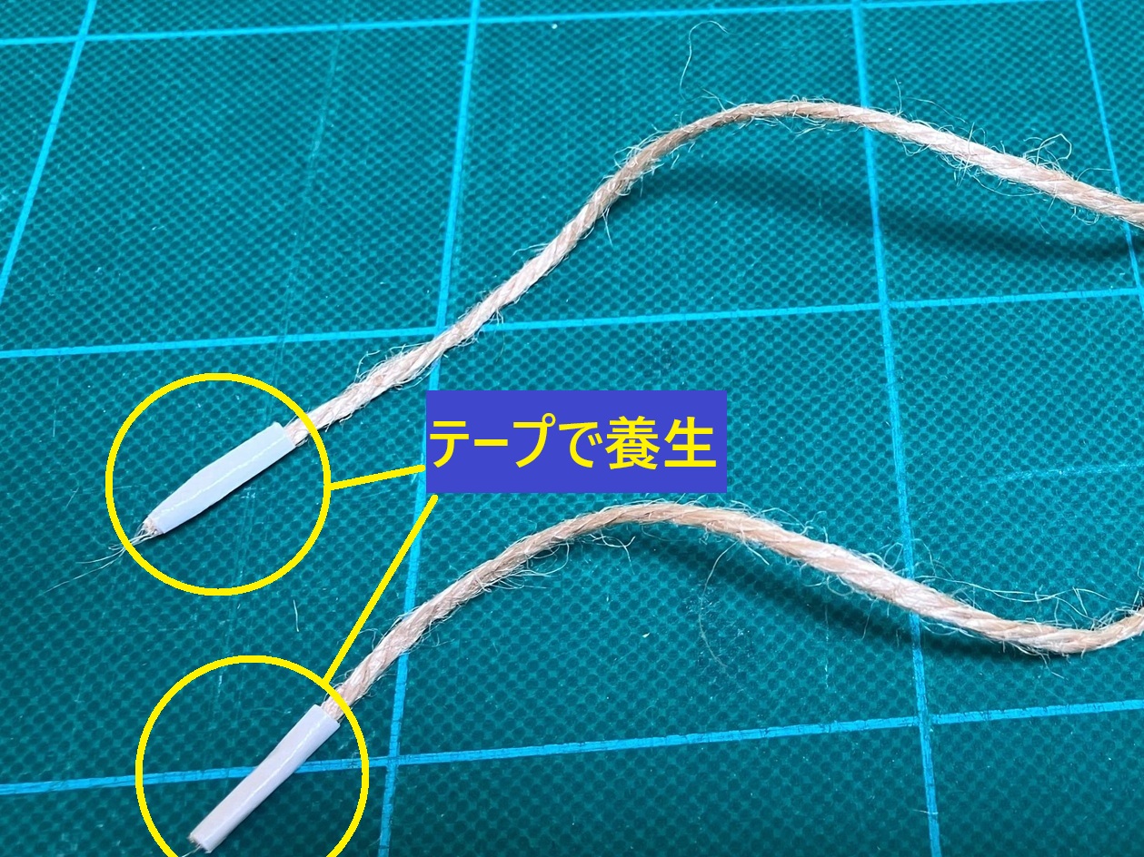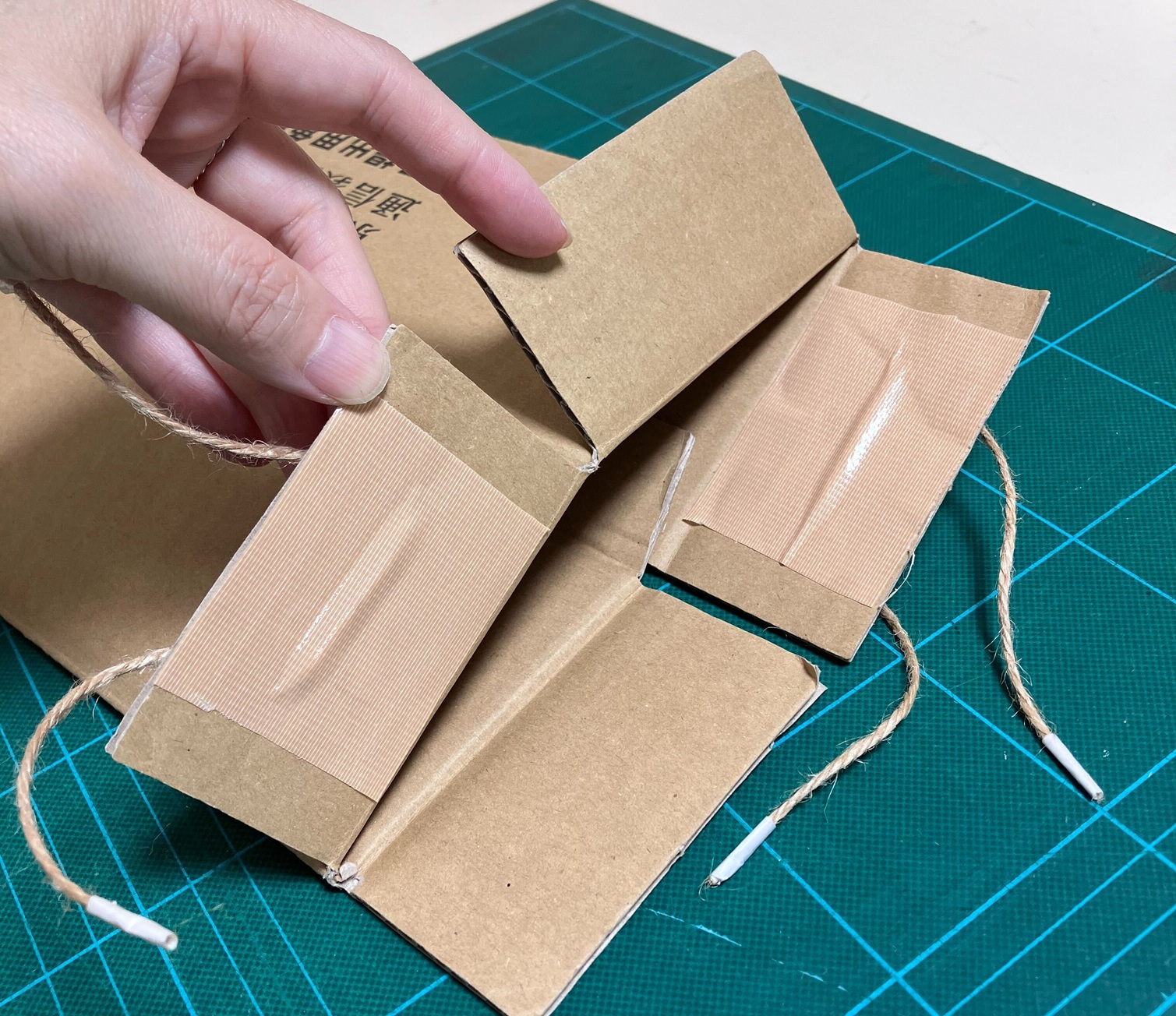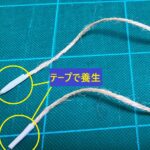 4:穴を開けた箇所にひもを通し、ガムテープで養生する。